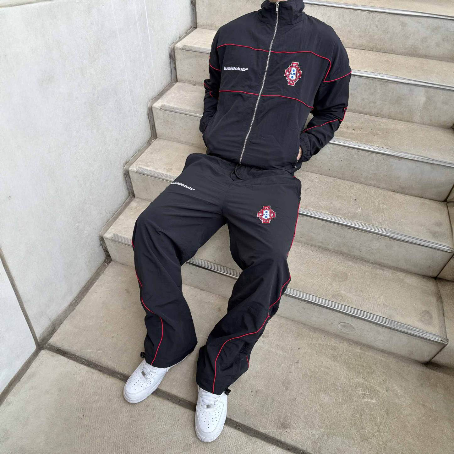 Black trackpants made of lightweight nylon with a loose, baggy silhouette. Red contrast stitching and two embroidered logos add subtle highlights. An elastic waistband with external drawstrings for tightening. Open leg cuffs with a loose fit. The relaxed cut combines comfort with urban style—perfect as a set or worn individually.